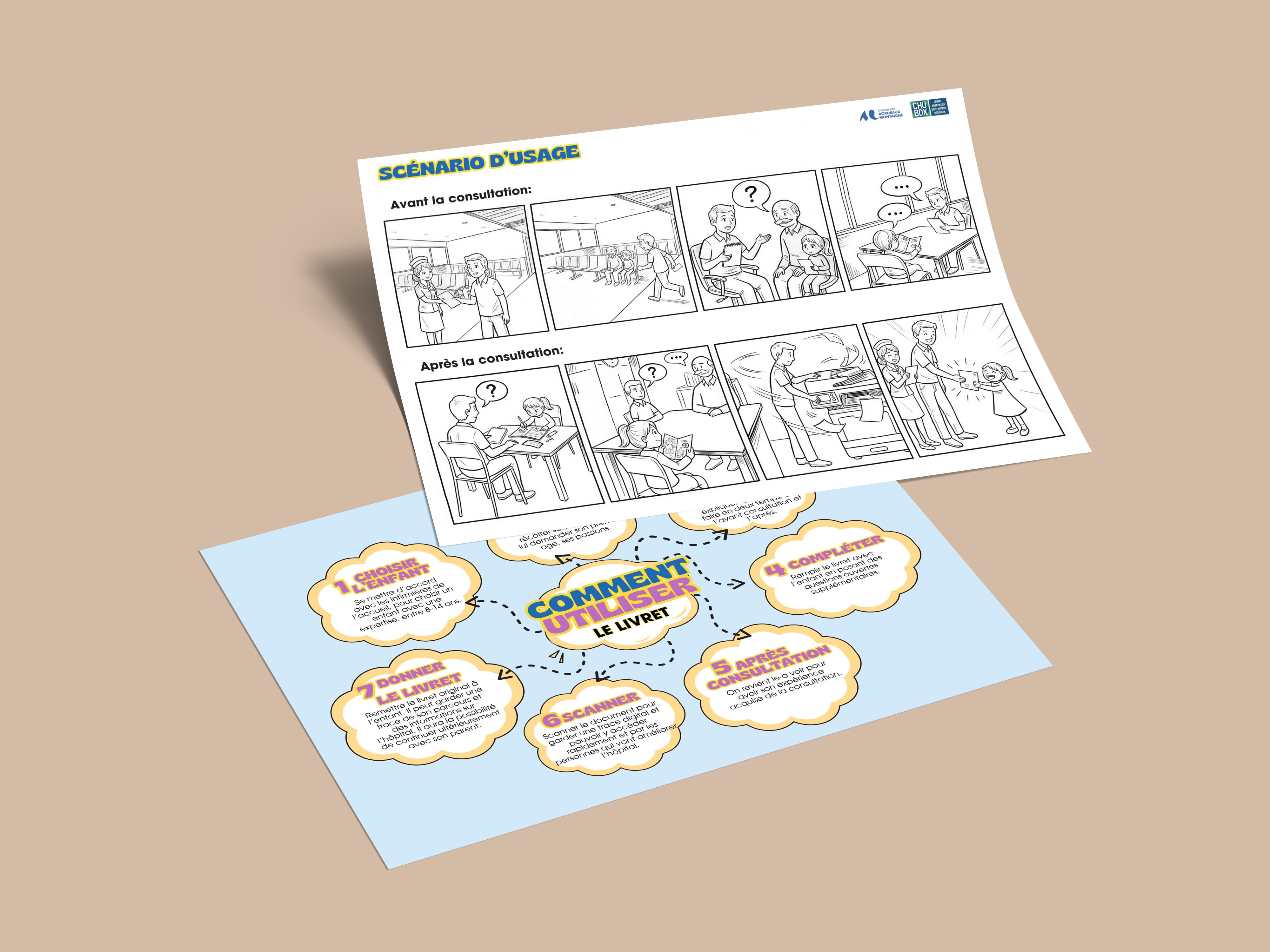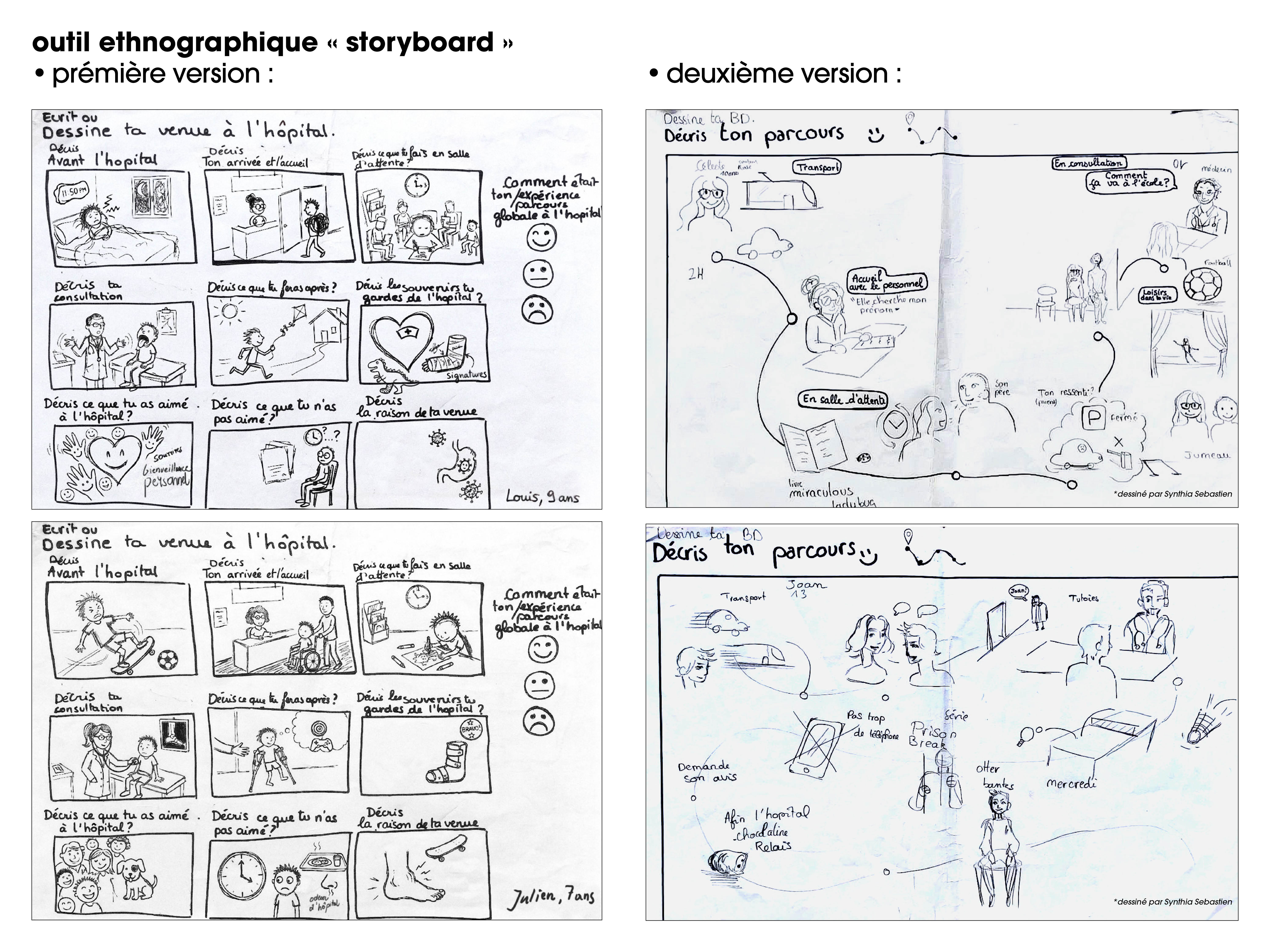 Comment recueillir l’expérience hospitalière des enfants en tenant compte de leurs modes d’expression, de leur âge et de leur vécu, afin de produire une parole à la fois libre et exploitable dans un cadre de soin ? Ce projet s’inscrit dans une recherche en design menée à l’hôpital pédiatrique du Pellegrin de Bordeaux, dans le cadre d’une thèse de Nawel Gabsi-Bernard consacrée à la place de l’enfant dans la conception des formes d’accueil hospitalières. J’ai travaillé en groupe et en immersion, dans un environnement contraint, en adoptant une posture de recherche située où le design devient un outil d’enquête et de médiation. Mon hypothèse initiale posait que la parole des enfants était peu intégrée dans leur expérience hospitalière. L’observation de terrain a confirmé que cette parole circule à travers des interactions majoritairement portées par les adultes, parents et personnel médical. L’enjeu était donc de rendre visible une parole peu structurée dans les parcours de soin, et de créer les conditions de son émergence. Une cocotte en papier, utilisée en salle d’attente pour une première phase d’expérimentation, a révélé qu'un outil ludique simple active l’échange, mais ne permet pas de construire un récit. J’ai alors orienté ma démarche vers des méthodes issues de la recherche qualitative, notamment l’élicitation (l'action de mettre en évidence ou de faire émerger des opinions, des émotions, etc.) par le dessin. En m’appuyant sur ces approches, nous avons conçu un outil basé sur le storyboard, permettant à l’enfant de retracer son parcours hospitalier. Les premières versions reposaient sur des cadres prédéfinis qui contraignaient l’expression, par conséquent leur suppression a permis d’observer une narration plus fluide et plus personnelle. Mon rôle a consisté à itérer ce dispositif de médiation, en structurant les conditions d’expression et en articulant les contraintes du terrain avec les apports méthodologiques. Les tests ont mis en évidence que l’enfant construit son récit dans une dynamique relationnelle, souvent en interaction avec le parent, dont la présence influence les réponses. Il semble également préférer que le dessin soit réalisé par nous pendant qu’il s’exprime, manifestant un intérêt pour conserver ces dessins ; le simple fait de dessiner pour lui constitue un levier d’engagement. Les échanges avec des psychologues et la direction des relations usagers ont renforcé cette approche, en validant l’intérêt d’une co-construction du récit, à la fois par les enfants et par les parents.